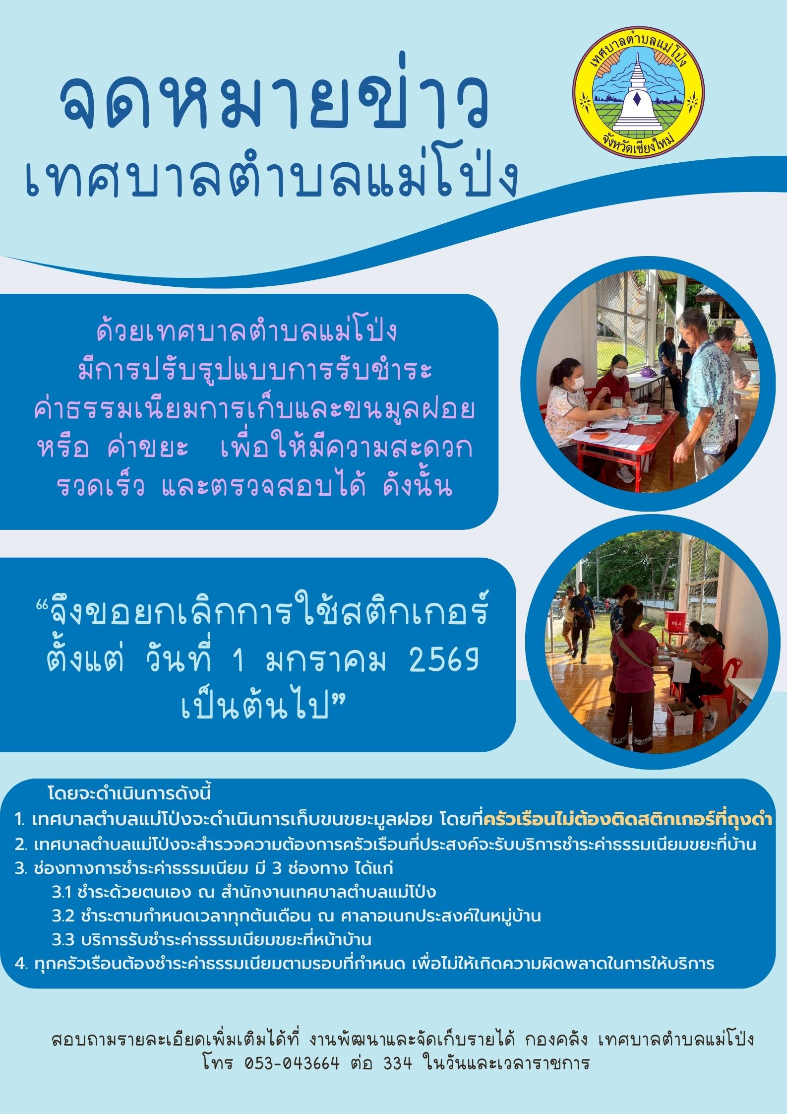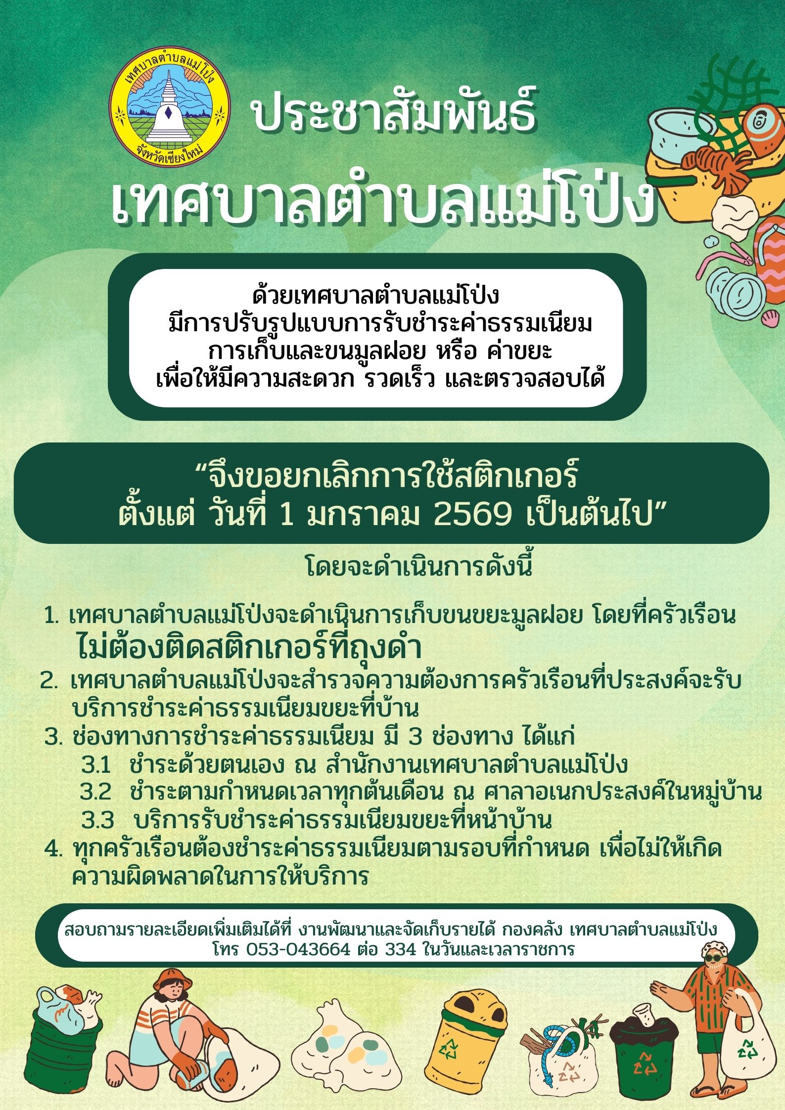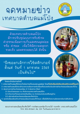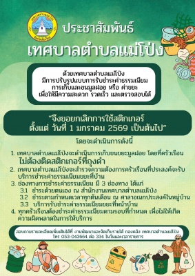 1. เทศบาลตำบลแม่โป่งจะดำเนินการเก็บขนขยะมูลฝอย โดยที่ครัวเรือนไม่ต้องติดสติกเกอร์ที่ถุงดำ