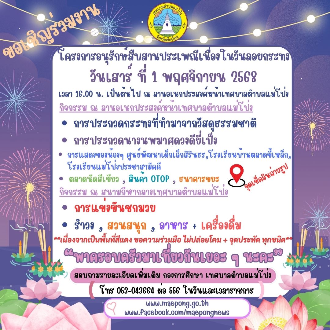 วันเสาร์ ที่ 1 พฤศจิกายน 2568 เวลา 16.00 น. เป็นต้นไป ณ เทศบาลตำบลแม่โป่ง "โครงการอนุรักษ์สืบสานประเพณีเนื่องในวันลอยกระทง" |