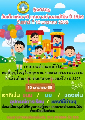 เพื่อมอบความสุขให้แก่เด็ก ๆ ในงาน วันเด็กแห่งชาติเทศบาลตำบลแม่โป่ง ประจำปี 2569 ซึ่งจะจัดขึ้นในวันเสาร์ ที่ 10 มกราคม 2569 ณ ลานสโมสรเทศบาลตำบลแม่โป่ง ระหว่างเวลา 08.00 12.00 น. ร่วมสนับสนุนของรางวัล อาทิเช่น ขนม นม ของเล่น อุปกรณ์การเรียน หรือของใช้ต่าง ๆ ได้ที่กองการศึกษา เทศบาลตำบลแม่โป่ง ตั้งแต่บัดนี้เป็นต้นไป ในวันและเวลาราชการ สอบถามรายละเอียดเพิ่มเติมได้ที่ หมายเลขโทรศัพท์ 053-043664 ต่อ 555 |